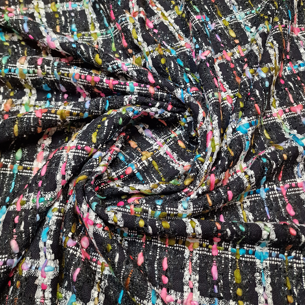 Kostýmovka typu Chanel, 25 % viskóza, 25 % vlna, 25% polyacryl, 25% lurex, šíře 130 cm, vhodná na kostýmky, saka, sukně, pouzdrové šaty.