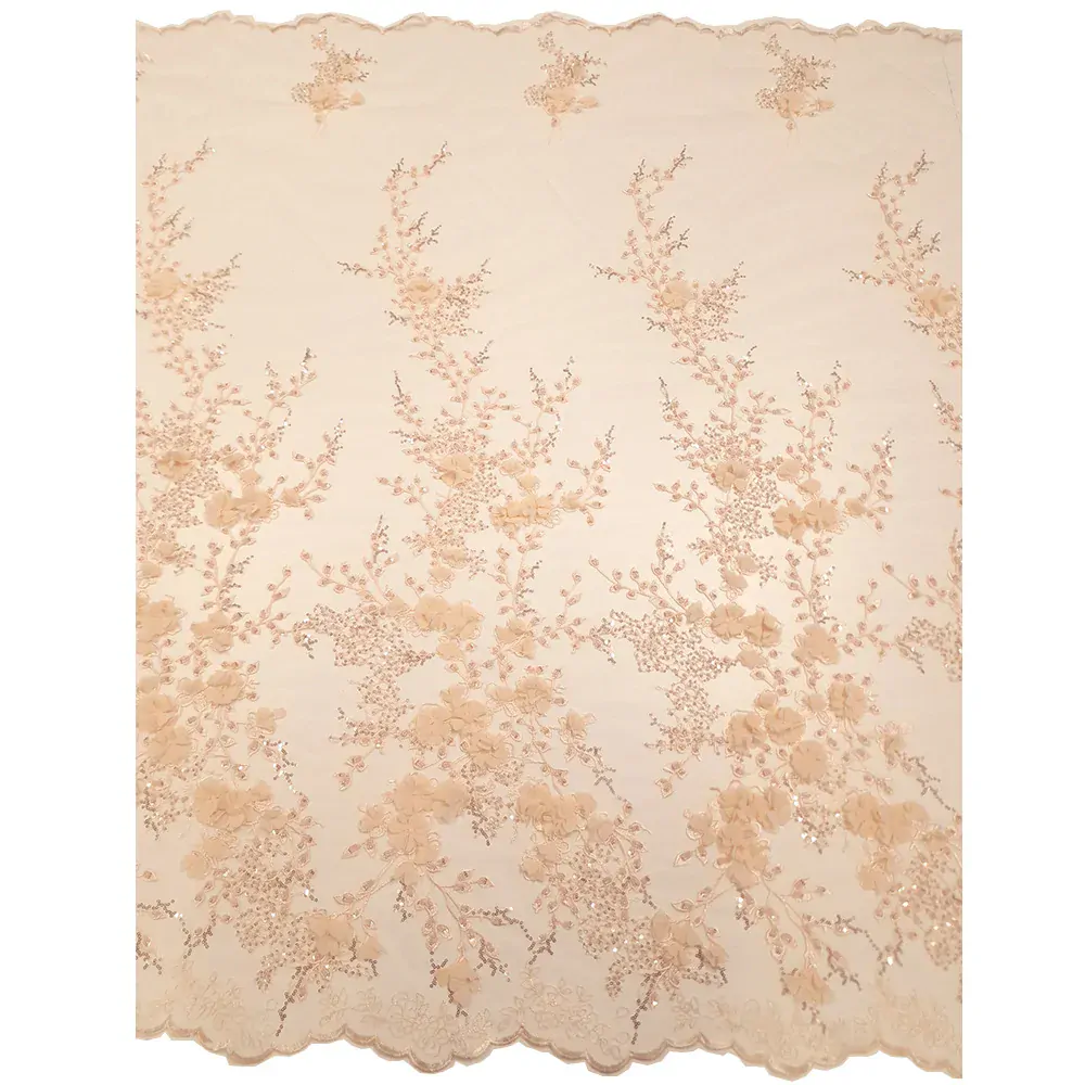 Polyamidová tylová krajka v broskvové barvě, s aplikovanými květy, korálami a pajetkami, šířka 130 cm.