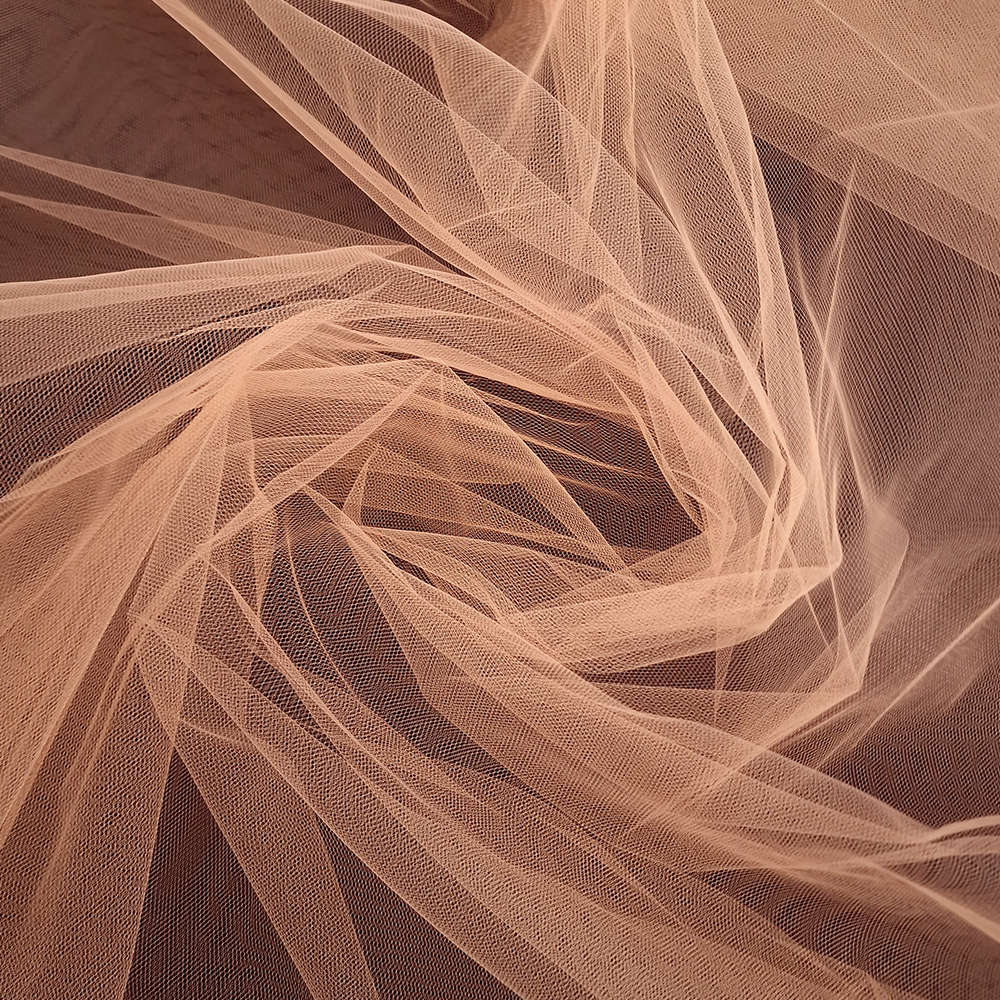 Polyamidový tyl , šíře 280 cm, jemný , jemná meruňková barva. Vhodný na závoje, vrchní sukně, dekorace.