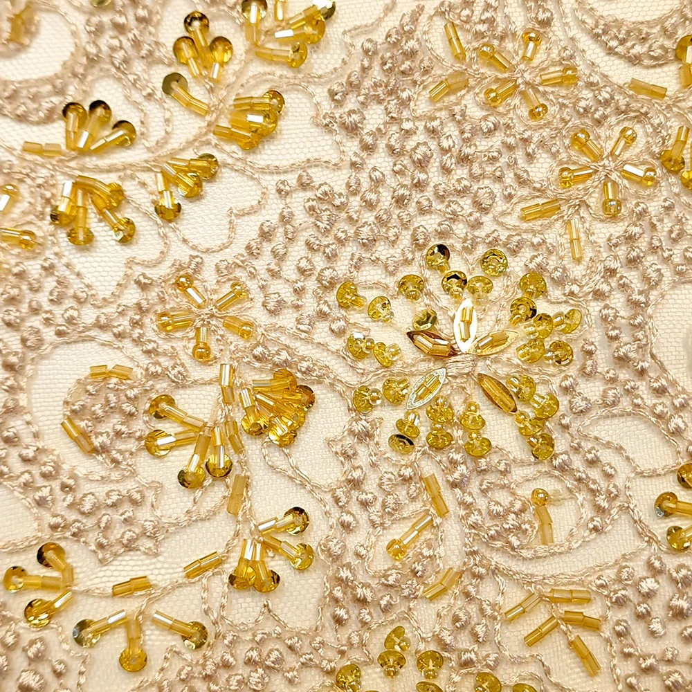 Polyamidová tylová krajka s aplikací korálků a flitrů, podklad champagne, korálky a flitry zlaté barvy, oboustranná bordura, šířka krajky 120 cm.