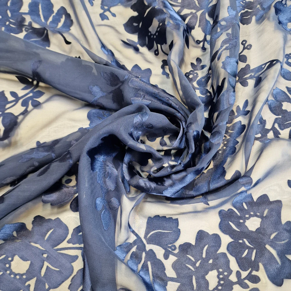 Devoré je šifon/satén z pravého hedvábí s laserovaným vzorem. Průsvitný šifonový podklad a vzor ze saténových růží jsou ve stejné (tmavonodré) barvě. Složení 60 % hedvábí, 40% viskóza, šířka 140 cm, vhodný na košile, halenky, šaty, široké sukně.